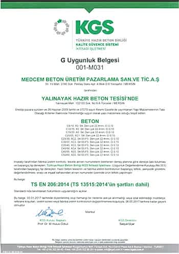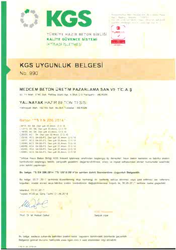 YALINAYAK HAZIR BETON TESİSİ KGS UYGUNLUK BELGESİ