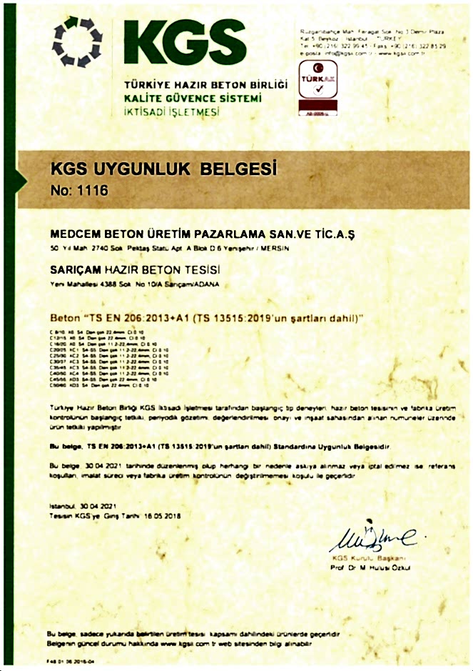 SARIÇAM HAZIR BETON TESİSİ KGS UYGUNLUK BELGESİ