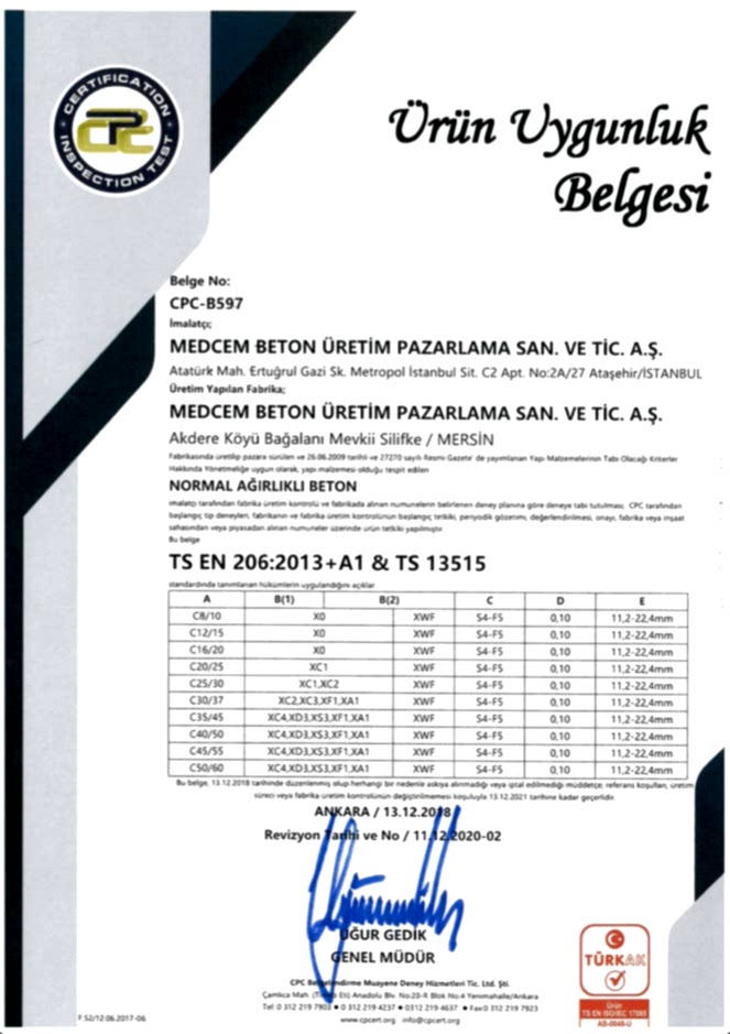 SİLİFKE HAZIR BETON TESİSİ ÜRÜN UYGUNLUK BELGESİ