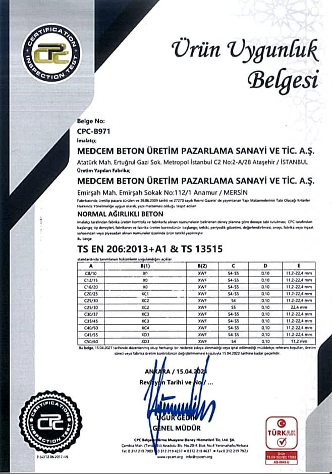 ANAMUR HAZIR BETON TESİSİ ÜRÜN UYGUNLUK BELGESİ